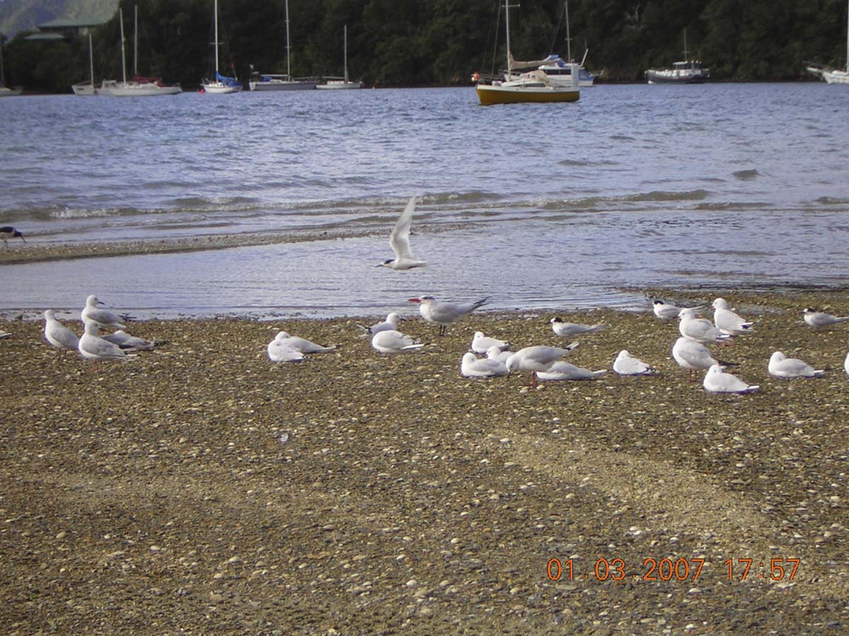 Caspian Turn or Taranui, Hydroprogne caspia visits Ngakuta Bay in small numbers every summer and is usally found amongst seagulls. Photo Foss Leach Enlarge |