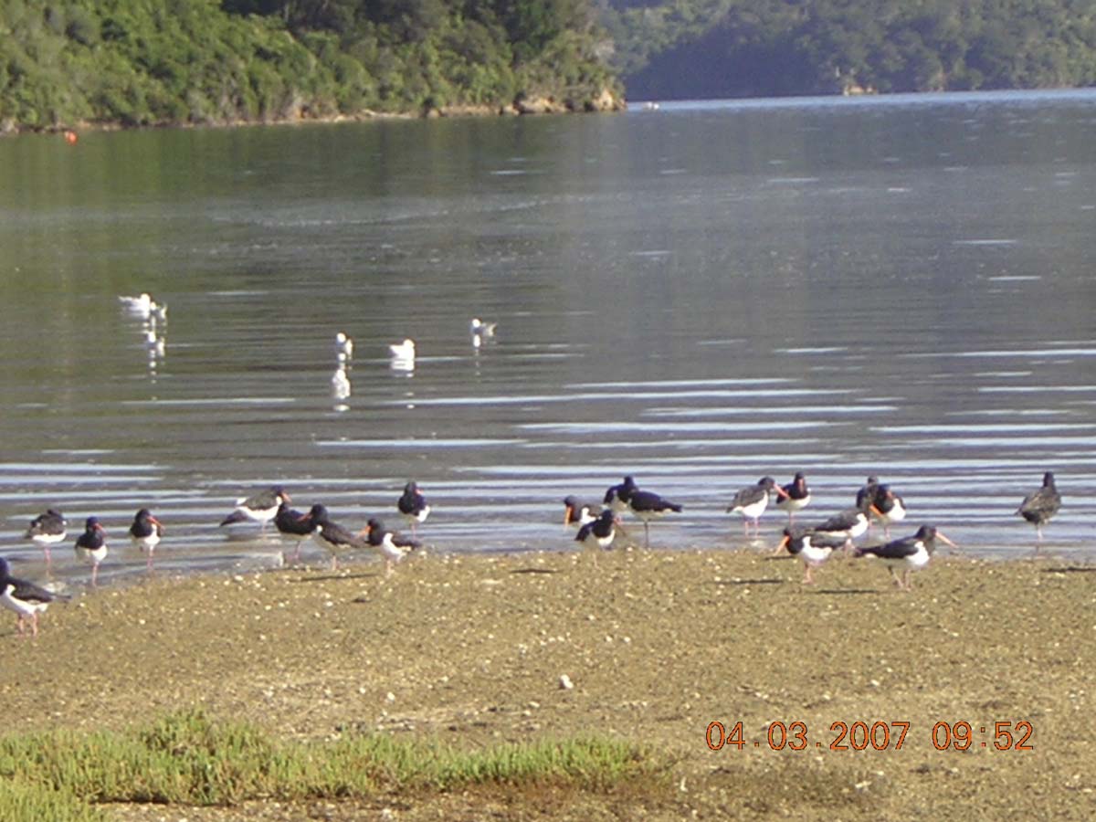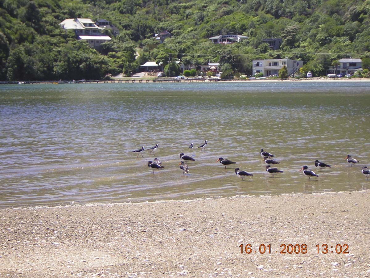 There are two species of oystercatcher in New Zealand: The South Island pied oystercatcher or torea Haematopus ostralegus finschi, and the variable oystercatcher Haematopus unicolor or torea-pango. The latter occurs either pied or totally black. They arrive in Ngakuta Bay in the summer, and usually there is at least one black individual (see on the right of the photo). Photo Foss Leach Enlarge |