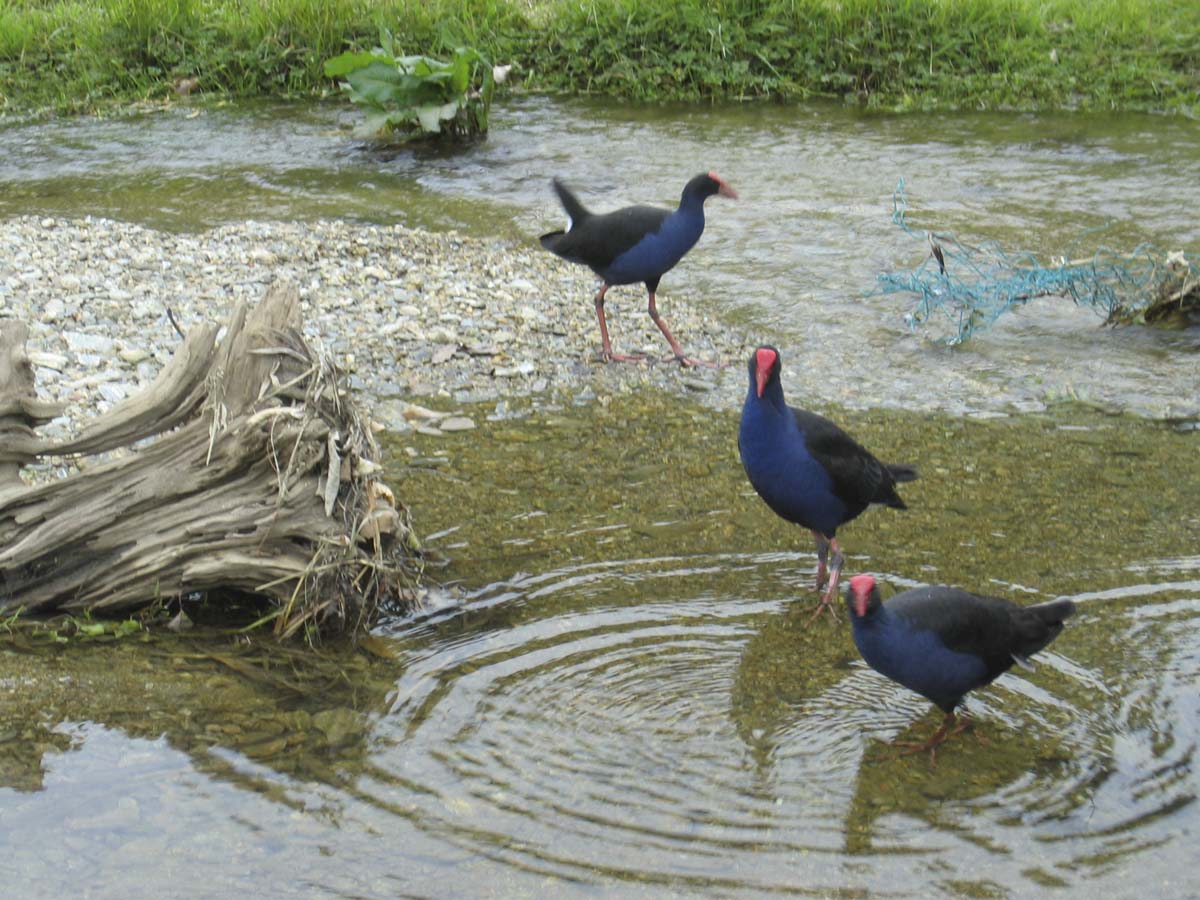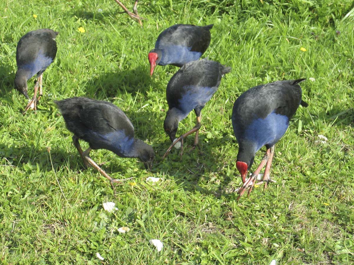 The purple swamp hen or Pukeko, Porphyrio porphyrio melanotus. These colourful birds are common in Ngakuta Bay and should continue to breed freely here so long as predators are kept at bay. They are normally very shy but quickly learn to take tid-bits from people. Like the closely related takahe this bird flew from Australia millions of years ago. Photo Foss Leach Enlarge |