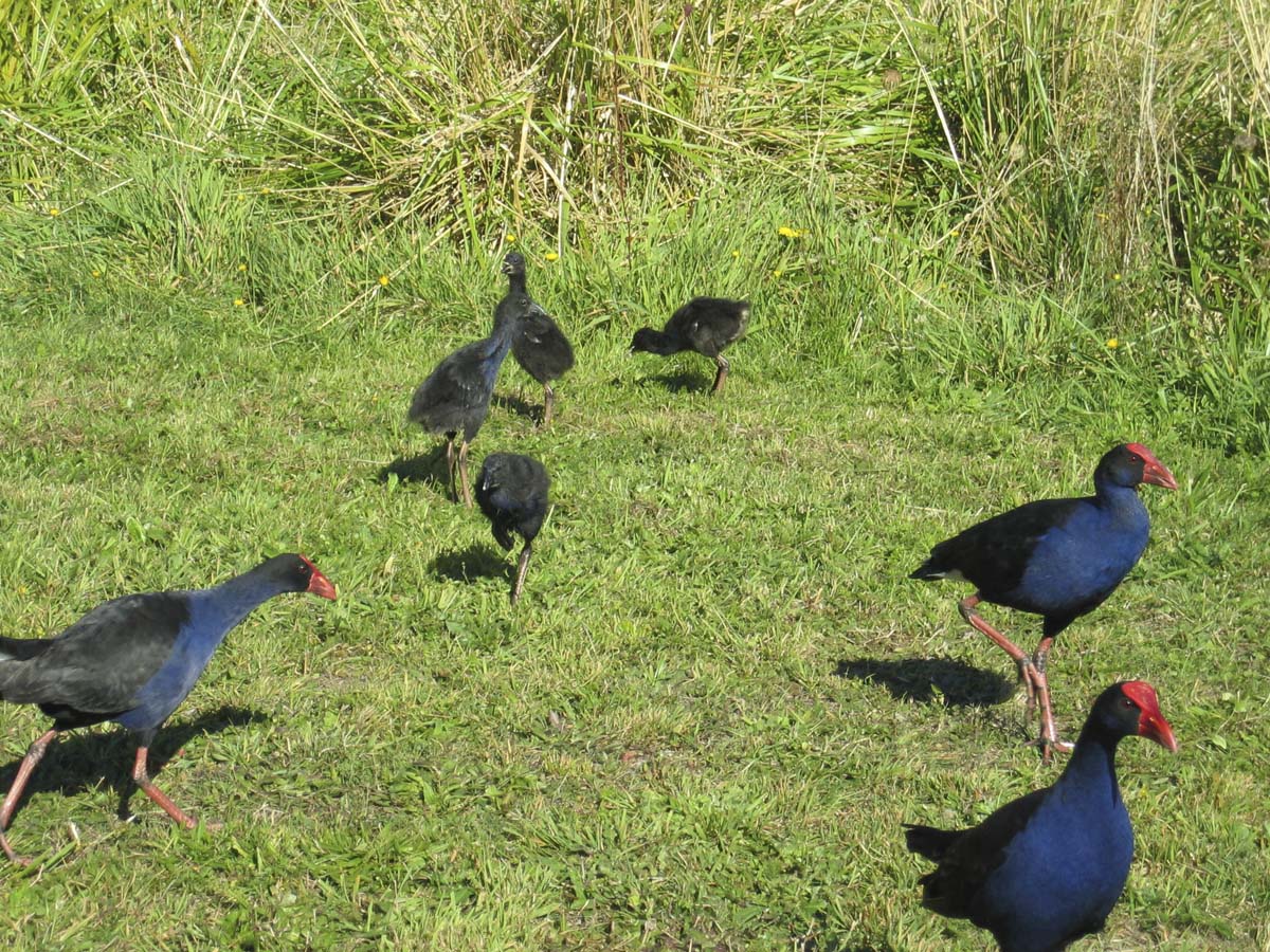 Another image of pukeko with fledglings. Note the beak has not developed the distinctive red colour. Photo Foss Leach Enlarge |