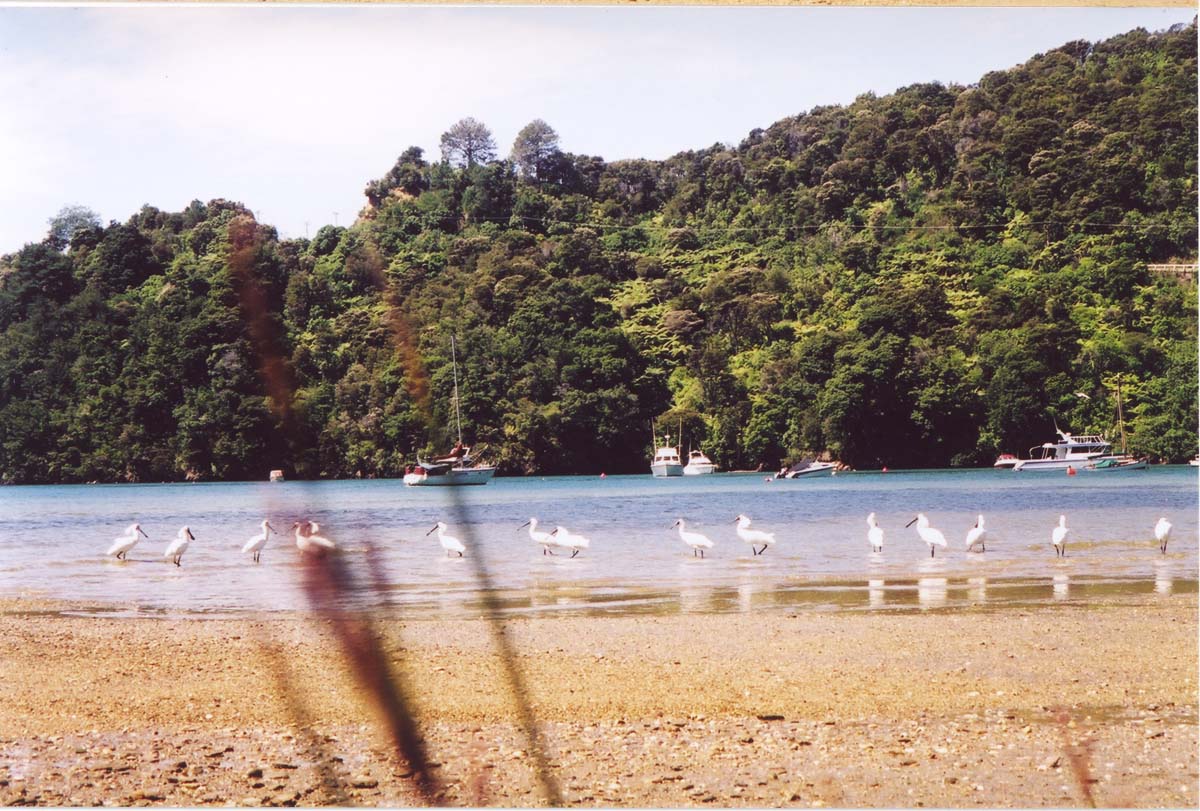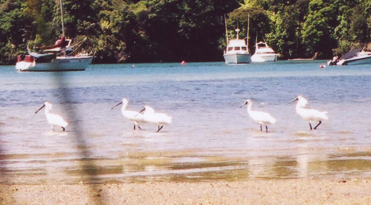Royal spoonbill or kotuku ngutu papa Platalea regia. According to Oliver there were only six sightings of this bird in New Zealand prior to 1930, but have since started coming here more regularly from Australia and the south-west Pacific. Maori has a name for them so they must have been here in pre-European times, even if rarely. The Maori name literally means the broad-billed kotuku, in recognition to its similarity with the white heron (kotuku). Fifteen of these gracious birds appeared at Ngakuta Bay in 2005. Photo Toni Van Der Velden Enlarge |