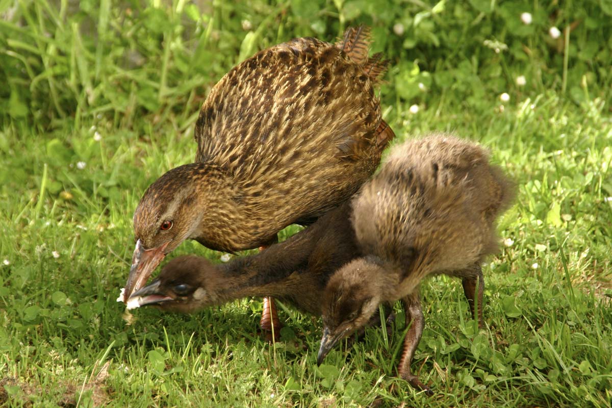 A young weka chick out exploring, but never far from Mum. Note the dark fluffy feathers of these youngsters. Photo Foss Leach Enlarge |